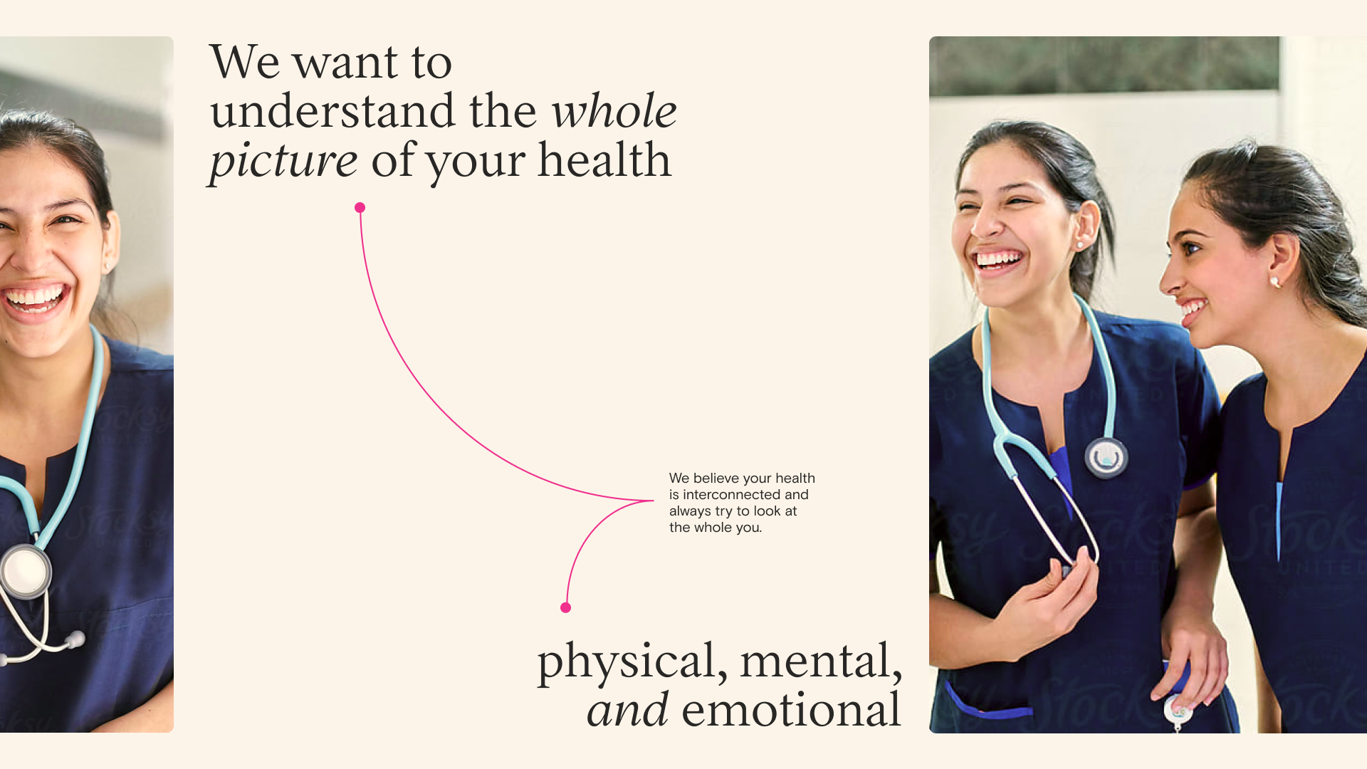 Tia’s new brand colors use warm and earthy tones inspired by nature to help patients feel calm and comfortable. New soft, tactile materials make women feel welcomed and immediately at home. Soft curves were added wherever possible to reflect the natural curves of our bodies. New typographic choices and fonts highlight Tia’s clinical expertise and feel both trustworthy and timeless. The new photography style celebrates real human bodies in all shapes and sizes. The suite of brand patterns connects the dots between art and science. We also created new welcome murals that were co-created with Tia providers to showcase their creative side. Last but not least, we designed a new logo that feels modern and mature but has a lowercase "t" to keep things conversational and approachable.