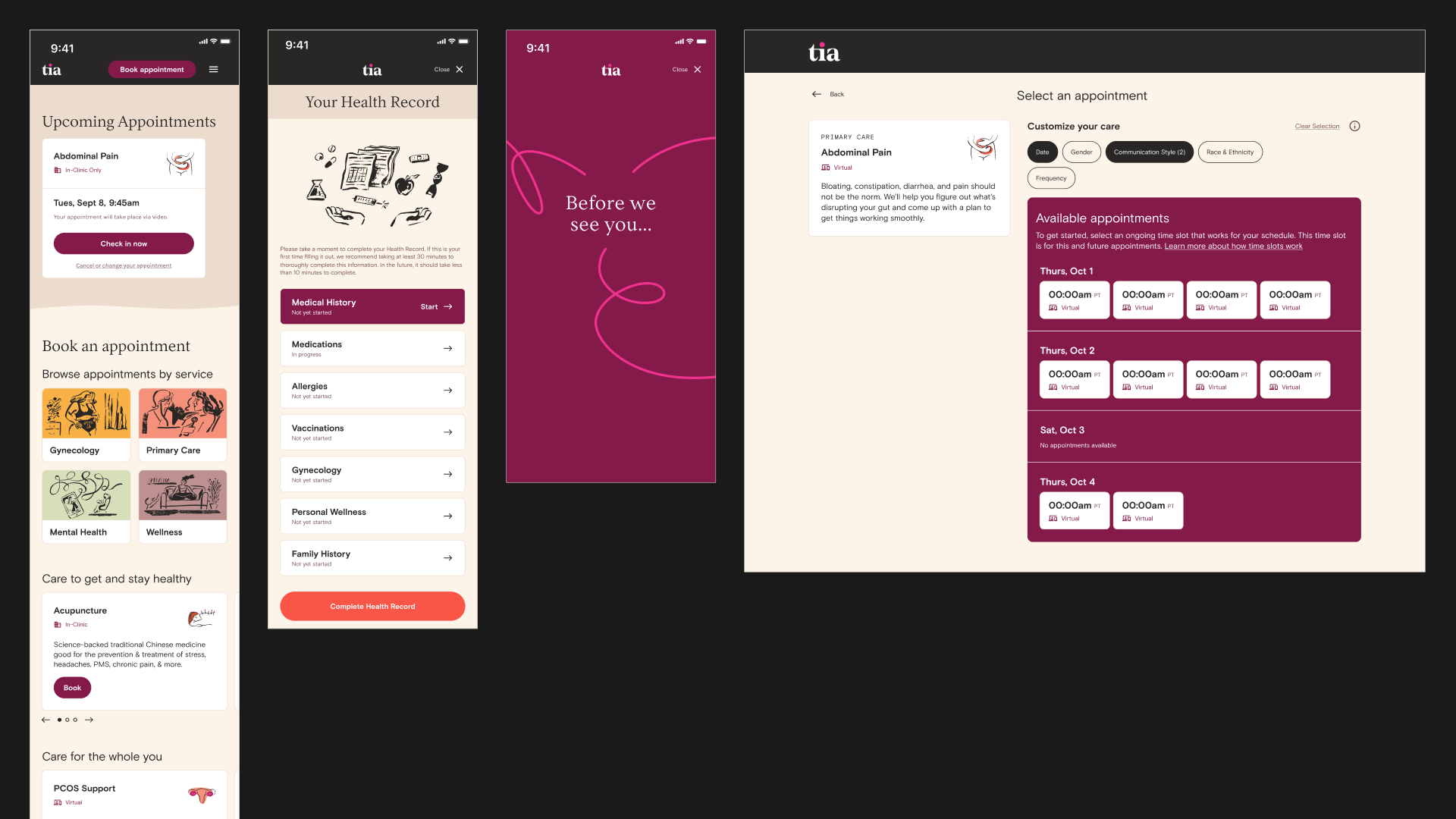 In early 2022, at Tia we recognized the need to evolve its brand identity to reflect the company's newly minted "whole woman, whole life" vision. To achieve this, we brought on an in-house interior design team to upgrade the look and feel of Tia’s spaces. Following this, we hired a women-led team from the branding agency, Athletics, to bring the new brand to life. The next few months were full of collaborative work sessions, user research and feedback sessions, and many conversations about Tia's identity over stacks of materials and samples.